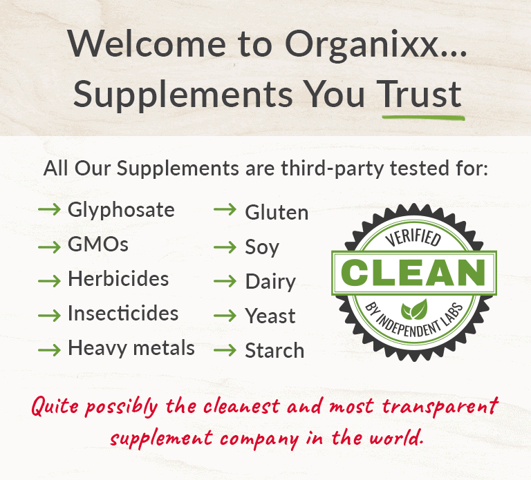 Organixx pays to have all our products tested by NSF (an internationally recognized leader in independent product testing) and other highly reputable third-party testing labs. These third-party laboratories test for glyphosate (the active ingredient in Roundup), GMOs, pesticides, herbicides, insecticides, and heavy metals. We're proud to be one of the few (if not the only) supplement companies to openly and honestly share all of the test results on our website. Click here to see 3rd-party test results for our Clean Sourced Multivitamin.