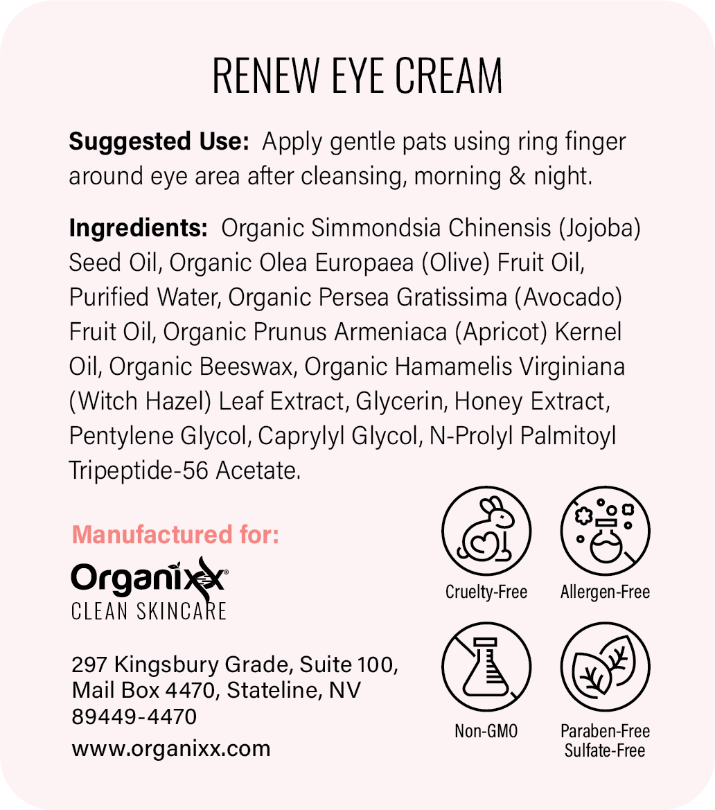 Renew Eye Cream is scientifically formulated to hydrate, smooth, brighten, and strengthen the skin around the eye. It contains only the very best clean and pure ingredients such as organic jojoba oil, organic witch hazel, manuka honey, and a highly advanced peptide technology that reduces eye puffiness, redness, dryness, and dark circles. The result is eyes that look younger and more vibrant than ever.
